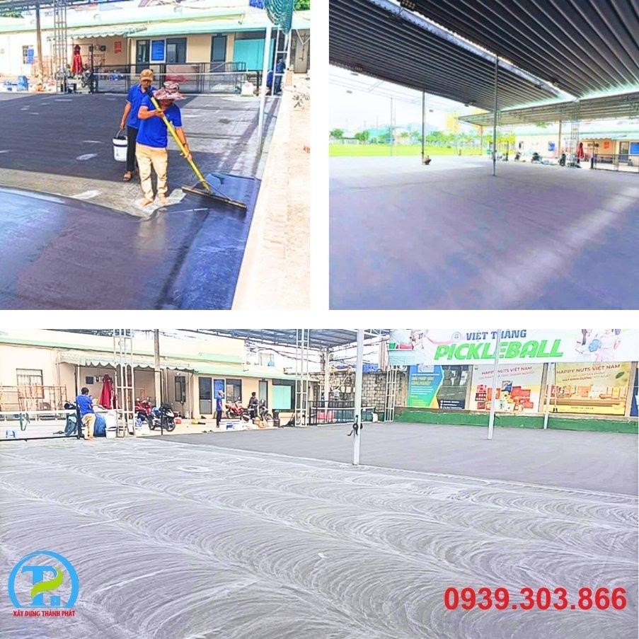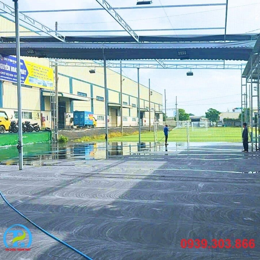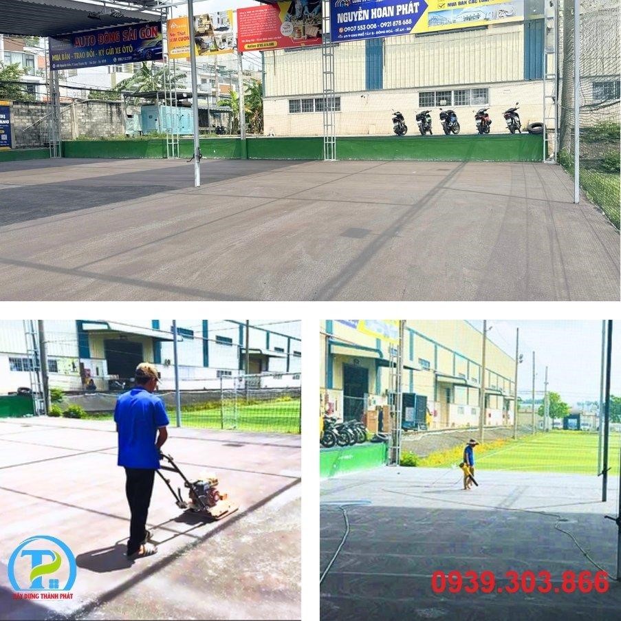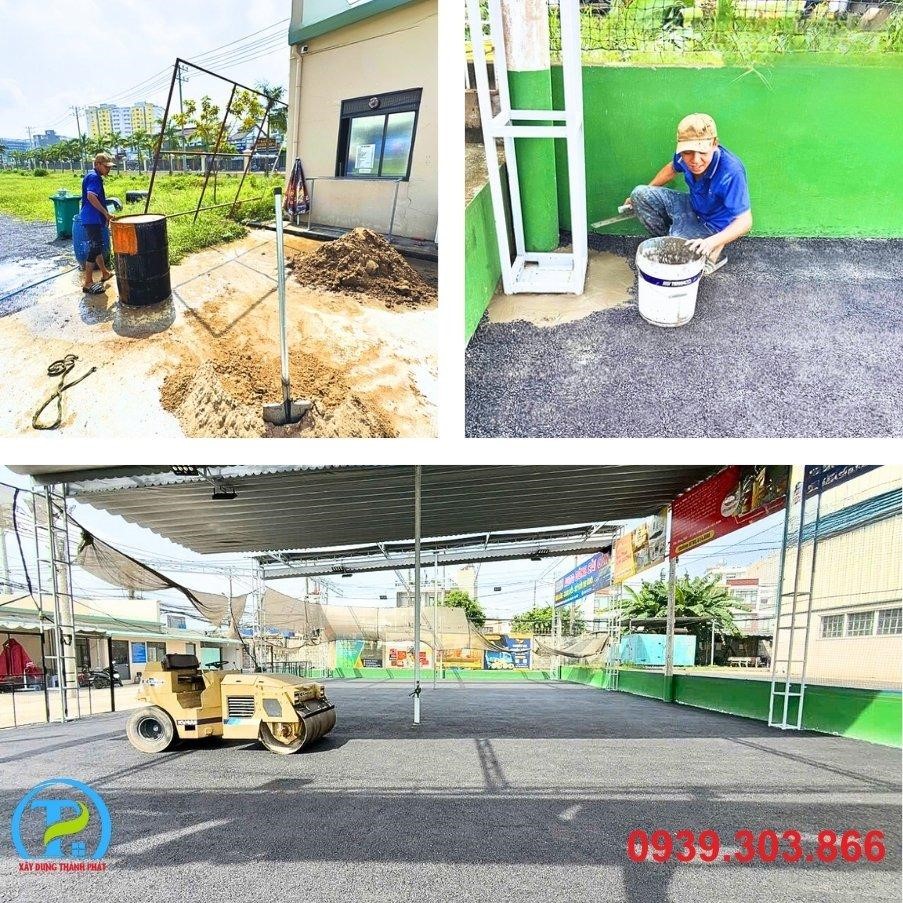 2. Xử lý nền móng: Thực hiện công tác san lấp, đầm nén, và đổ bê tông/asphalt nền móng với độ dốc thoát nước tiêu chuẩn (0.5% – 1%). Đây là bước nền tảng quyết định tuổi thọ và độ phẳng của sân.