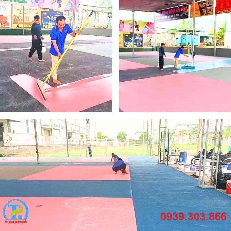 3. Thi công lớp phủ kỹ thuật: Tiến hành thi công các lớp sơn chuyên dụng. Quy trình này bao gồm lớp đệm (cushion layer – nếu có), lớp màu chính và lớp hoàn thiện chống tia UV. Kỹ thuật viên đảm bảo độ dày lớp sơn đồng đều, đạt chuẩn ma sát để tối ưu hóa trải nghiệm chơi.