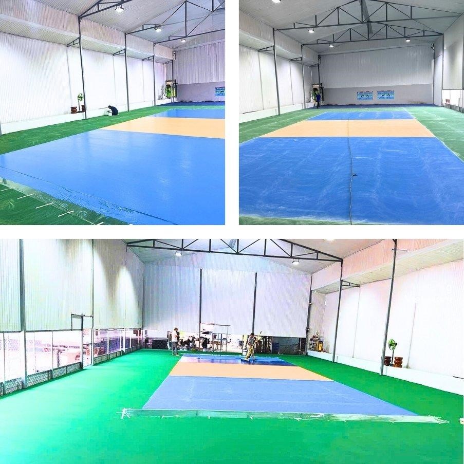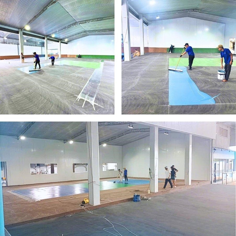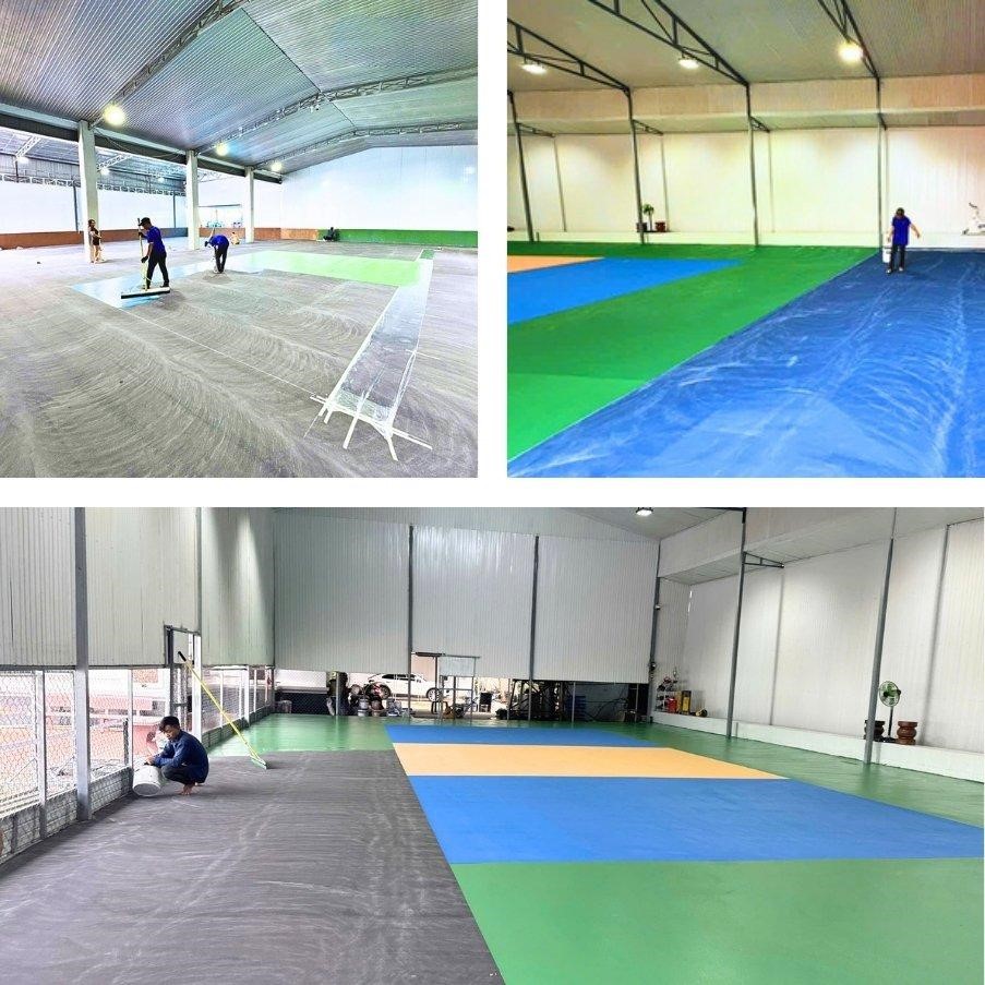 - Hệ Thống sơn chuyên dụng: Áp dụng nhiều lớp sơn Acrylic chuyên biệt, bao gồm lớp lót chống thấm, các lớp đệm giảm chấn thương, và lớp sơn hoàn thiện chống trượt, bền màu, chịu được thời tiết.