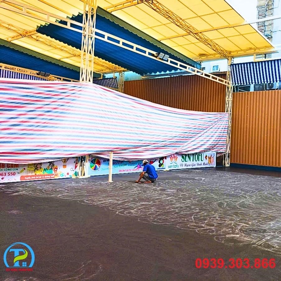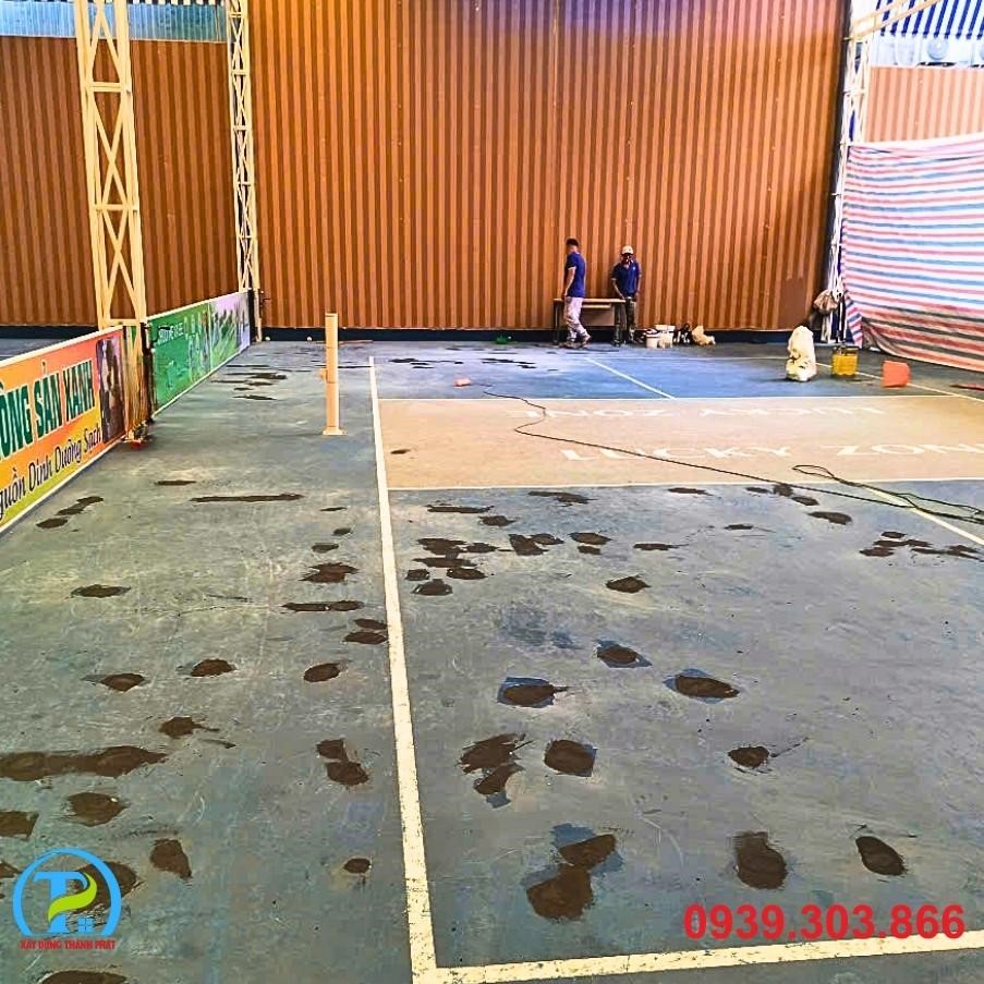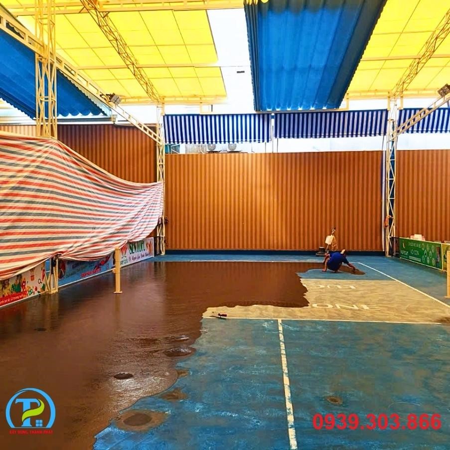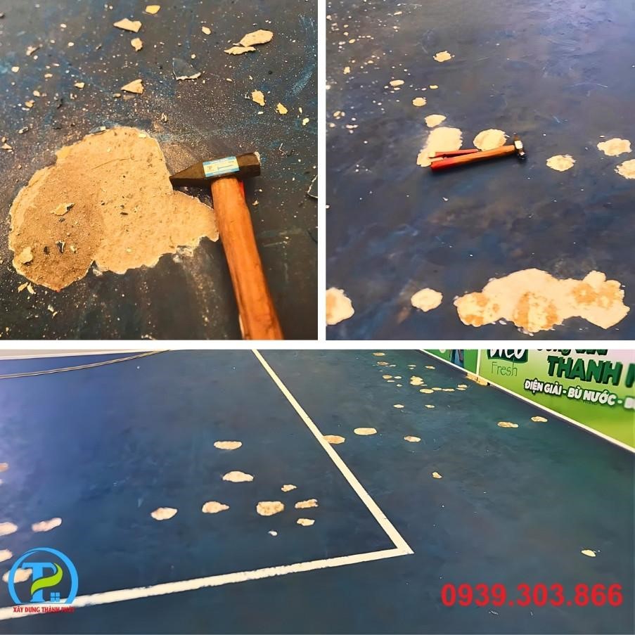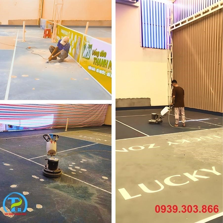 • Xử lý nền: Tiến hành mài, vá, và làm sạch toàn bộ bề mặt hiện có. Đảm bảo mặt nền đạt độ phẳng và độ dốc tiêu chuẩn để thoát nước tốt, tránh đọng nước trên sân.